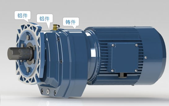 (1)、輕量化設(shè)計(jì) 本款減速機(jī)首次采用鋁件(法蘭與箱體)與鑄件(端蓋)相結(jié)合的設(shè)計(jì)理念(如圖1),在保證強(qiáng)度的情況下,大化的減輕整機(jī)重量,使整機(jī)重量降至21KG(以接0.75KW電機(jī)為例)。同時(shí)端蓋采用鑄件材料能有效的揮發(fā)出高速級(jí)所產(chǎn)生的熱量,促使整機(jī)溫度平衡。